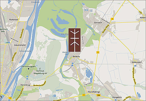 | In der umfangreichen Ortschronik ist zu lesen: "Erst mit der am 21. Juni 1832 vom preußischen König Friedrich Wilhelm III. unterzeichneten Kabinettsorder begann der Aufbau der Zeigertelegrafenlinie von Berlin nach Koblenz (587 km) unter Einsatz von 61 Stationen. Die Signaltürme standen in einem Abstand von 1 1/2 Meilen (ca. 11,3 km). Für den Aufbau der Stationen 8 in Möser bis 14 in Magdeburg war der Ingenieur Hauptmann Heise aus Magdeburg verantwortlich. Hauptinteresse an dieser neuen Nachrichtenübermittlung hatte das preußische Militär. Es stellte daher auch die Bedienungsmannschaften in den Stationen. Die Funktionsweise dieser Stationen war so, daß ein Soldat mit einem Fernrohr die Zeigerstellung der Nachbarstation ablas, während der zweite Soldat die ihm angesagten Stellungen auf die sechs Einzelarme seines Mastes übertrug. Es ließen sich bemerkenswerte 4.096 Kombinationen an den Flügeln einstellen. Der Königlich-Preußische Telegrafendirektor Franz August O’Etzel ließ vereinheitlichte Telegrafenstationsgebäude entwerfen. | ![]() Auf der Übersichtskarte von Google die Lage des Ortes in der Wasserlandschaft Am 17. März 1848 konnte mit diesem optischen Zeigertelegrafen eine Depesche mit 30 Worten in 90 Minuten von Berlin nach Köln übermittelt werden, was zur damaligen Zeit eine überaus ansprechende Übertragungsgeschwindigkeit war. Eine weitere Depesche mit 210 Worten benötigte am 2. Februar 1840 etwa 13 Stunden. In dieser Zeitspanne waren die Abgabe im Telegrafenbüro in Berlin sowie die Übergabe des Klartextes an einen Kurier in Köln enthalten. Aber schon 1849 setzte sich die elektrische Nachrichtenübermittlung durch, und aus der Telegrafenstation Nr. 13 entstand ein Wohnhaus. Der Telegrafenturm wurde 1957 beim Umbau des Hauses entfernt. Eine Vorstellung, wie der Telegrafenturm in Biederitz ausgesehen haben könnte, vermitteln die Darstellungen des Entwurfs einer Telegrafenstation."